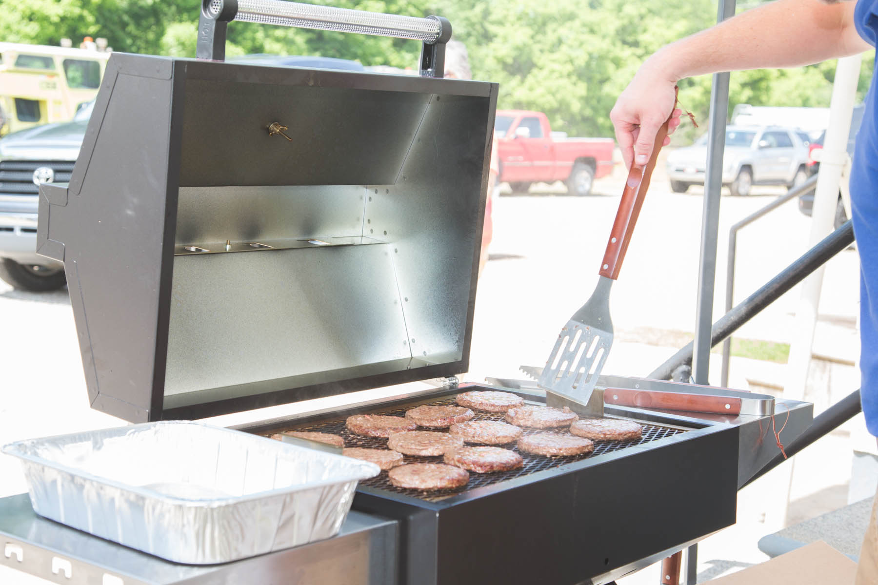 2) Burgers will puff up in the middle as they cook, making the tops rounded and awkward for keeping the toppings in place.   To avoid this, press a little indentation into the top of each raw patty with your thumb or the back of a spoon. Then, when the center pushes up, the top of each burger will be relatively level.